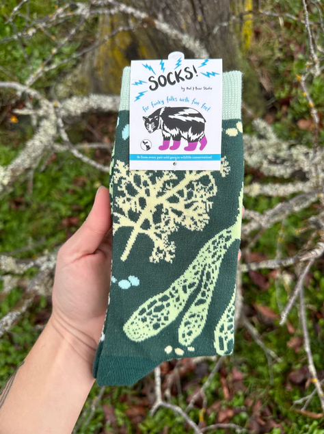 "All the socks are One Size, but they fit BEST for sizes 8-10. My feet these photos are a “Women’s” size 7 - you can see there’s a bit of wiggle room in the toes and heels but the socks fit comfortably. My partner also wears them, and their feet are "Men's" size 10/11 and it's a super comfortable fit. Socks would very likely fit larger feet as well!