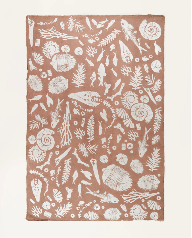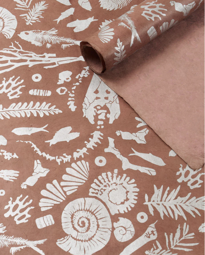 Make your gift stand out with a touch of history using this one-of-a-kind fossil wrapping paper with a shiny silver print on a stone brown background.