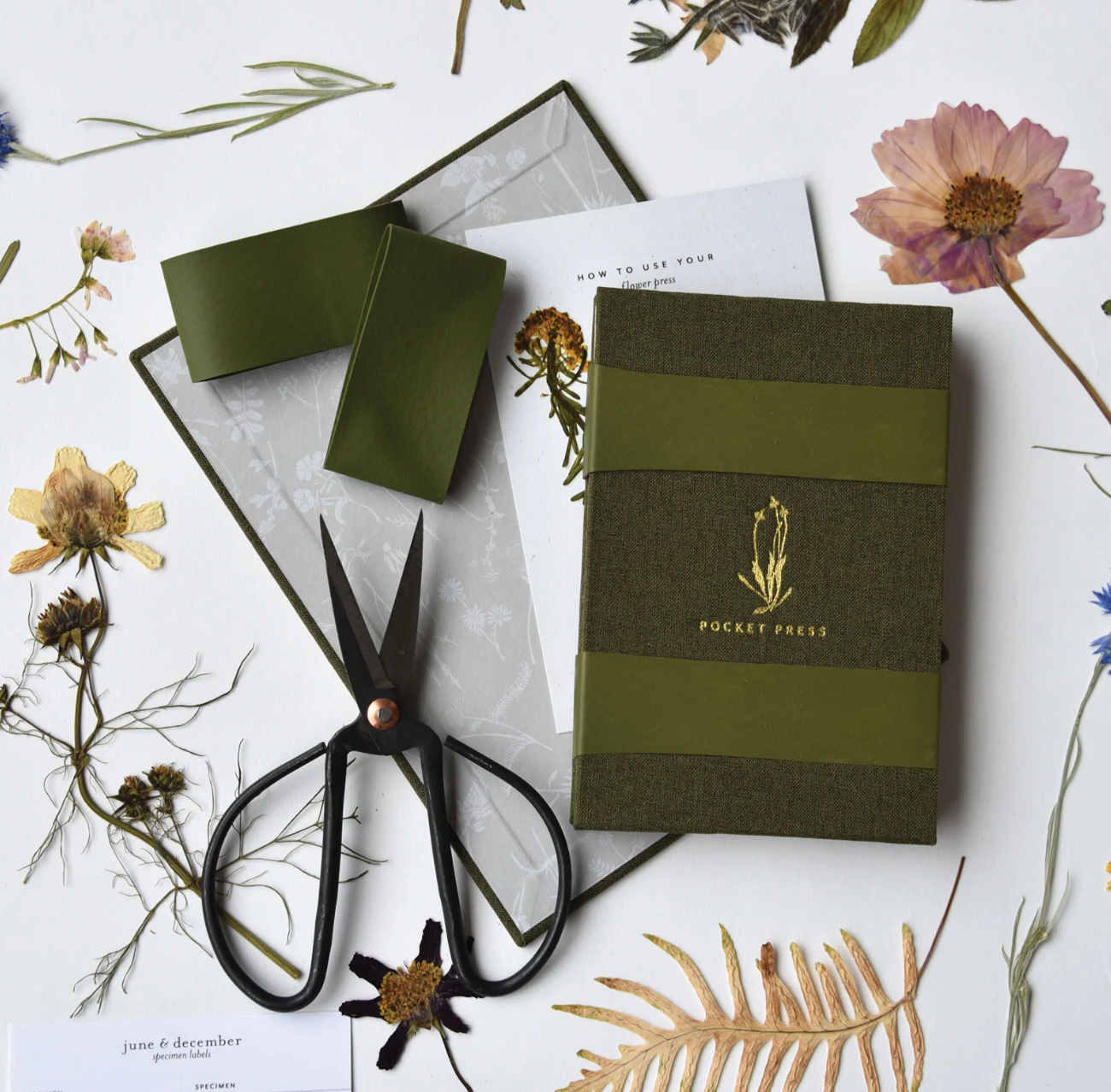 June & December designed their Field Press to be light for travel, functional for use in the wild, and pretty to look lovely on a shelf while they work to press your botanical specimens. These linen-covered presses include reusable pressing cards made from 100% PCW recycled, acid-free card stock to best preserve your botanical specimens. Each press has a gold foiled wildflower on the cover with patterned inside cover details and includes two heavy bands, seven reusable pressing cards, and an instruction card.