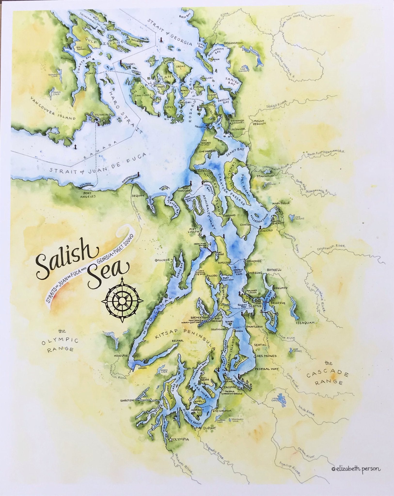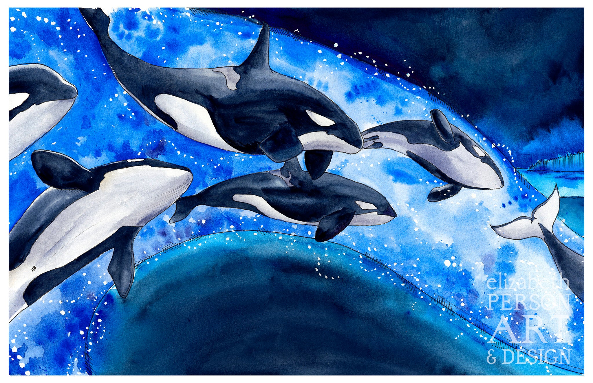 Original illustrations on 5" x 7" notecards with white linen texture envelopes. The Sailish Sea, The San Juan Islands, Washington State and Orca Dreams.