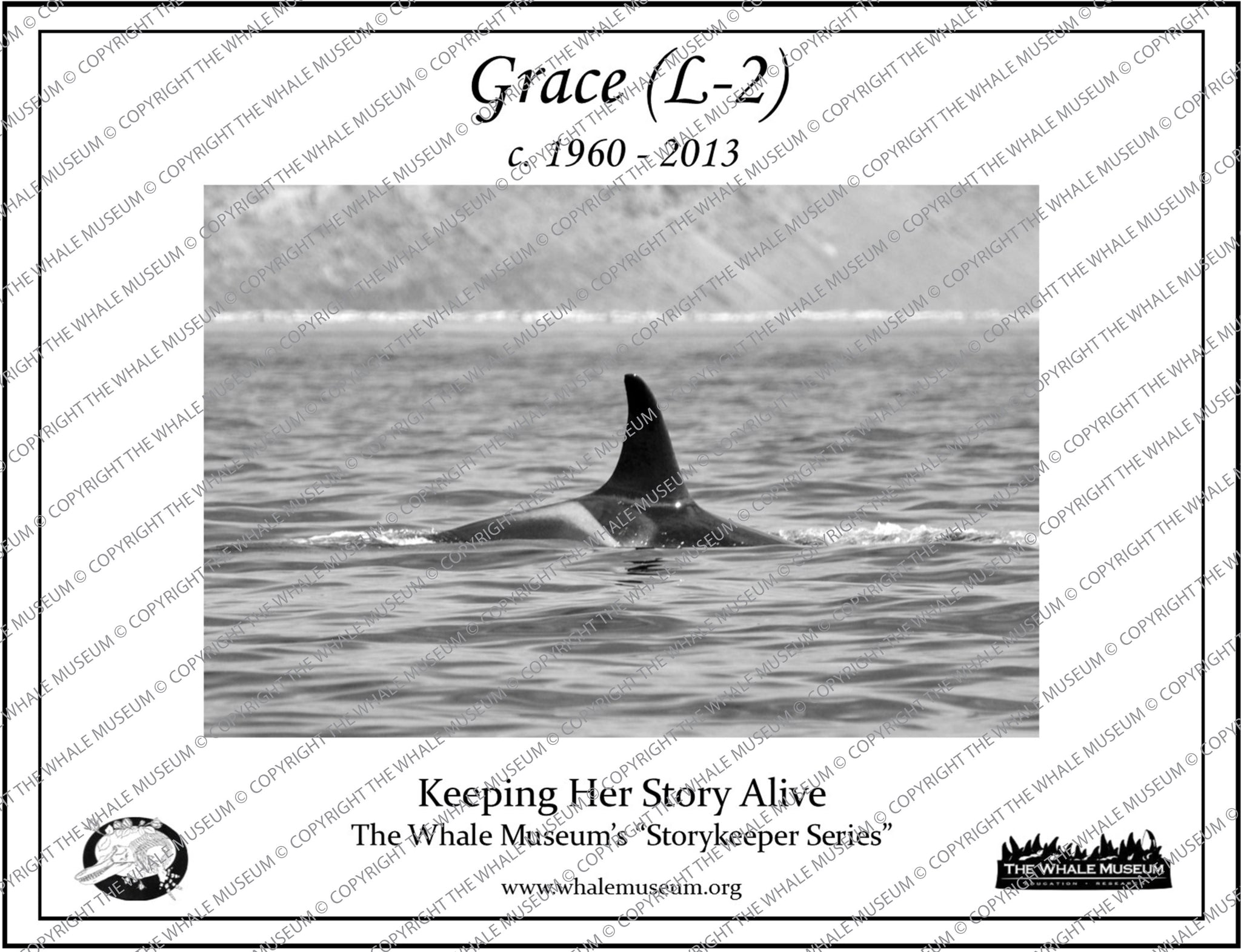 Grace (L-2) was an easy whale to identify because she had two small nicks near the tip of her dorsal fin, and a more noticeable nick at mid-fin. Her saddle patch was very open on both sides. Grace (L-2) had four offspring and her family was always a very cohesive group. She was the grandmother to Luna (L-98) who became separated from L Pod in 2001 and is the subject of a movie and a book.