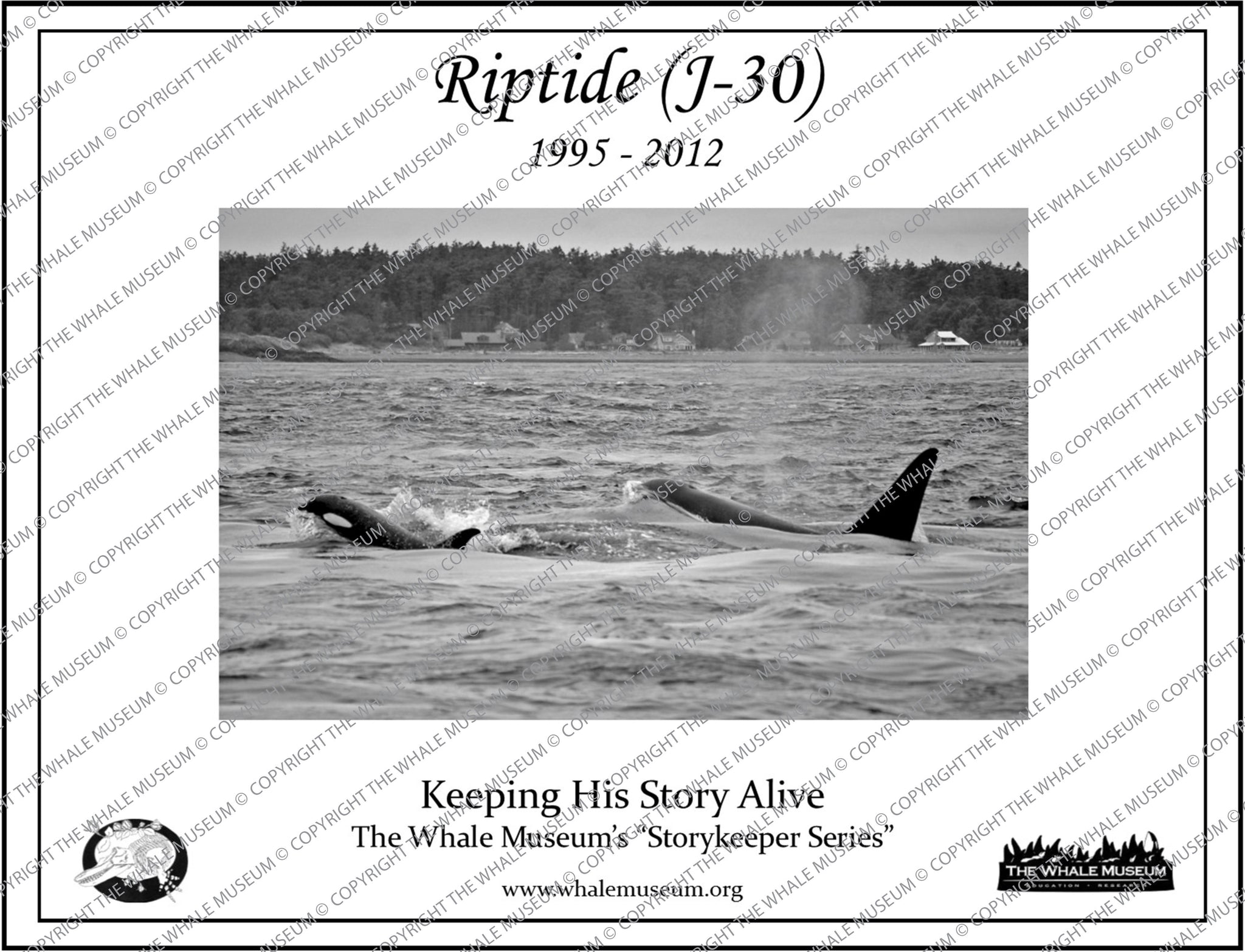 Riptide (J-30) was named for the word that describes a surface disturbance of water caused by tides and currents- a common occurrence in the San Juan Islands. He was a member of Ruffle (J-1)'s family and seemed to spend a great deal of time with him. Riptide (J-30) did not return to the inland wates in February of 2012 and it is thought that he died sometime that winter.