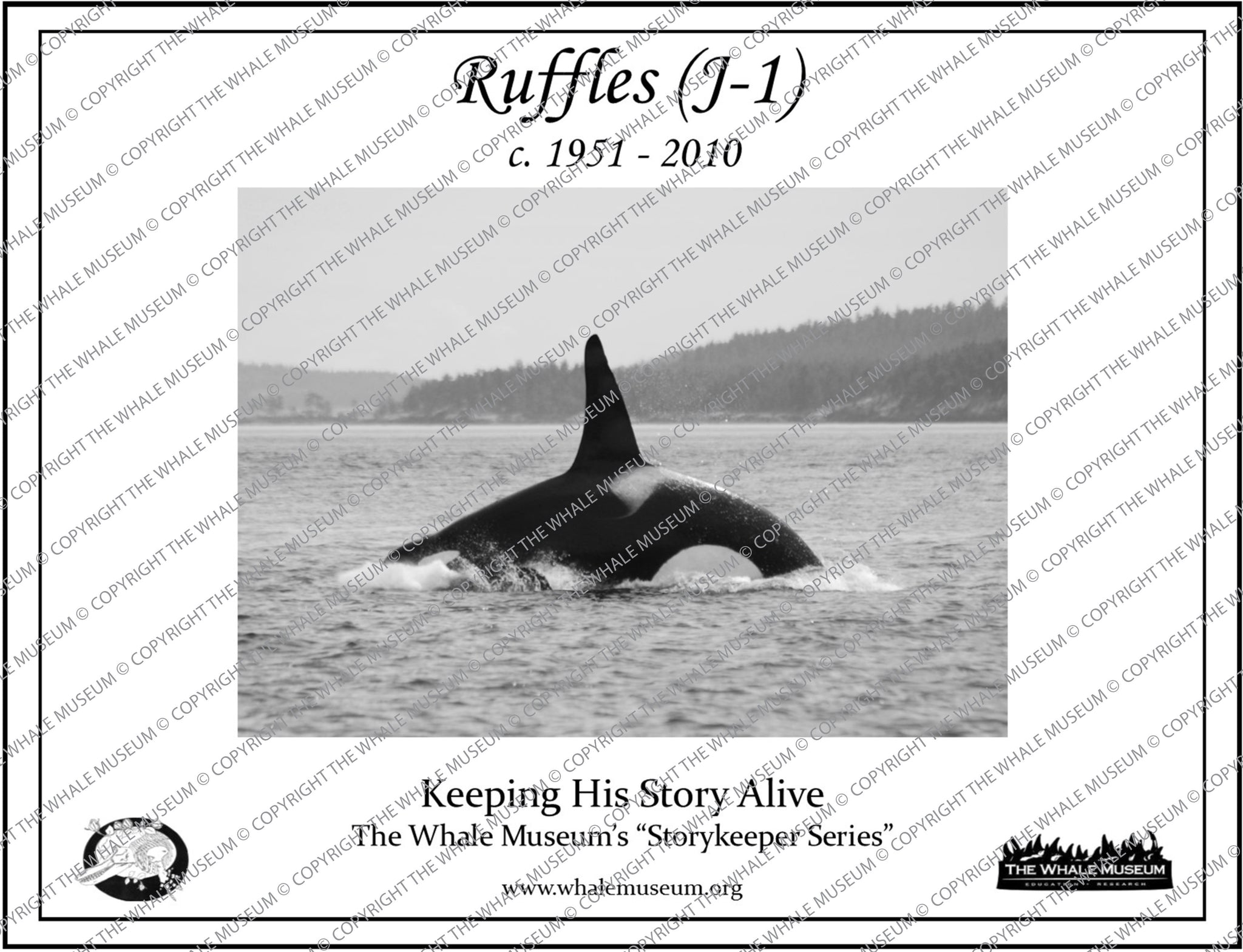 Ruffles (J-1) was first seen during a capture operation in October 1968. He was captured but later released because he was too big to transport. Ruffles (J-31) was extremely easy to recognize because of his tall wavy dorsal fin. He was featured in the Free Willy movies and was photographed by thousands of visitors from around the world. Researchers followed his movements for decades, and naturalists have journals full of chronicles about him.