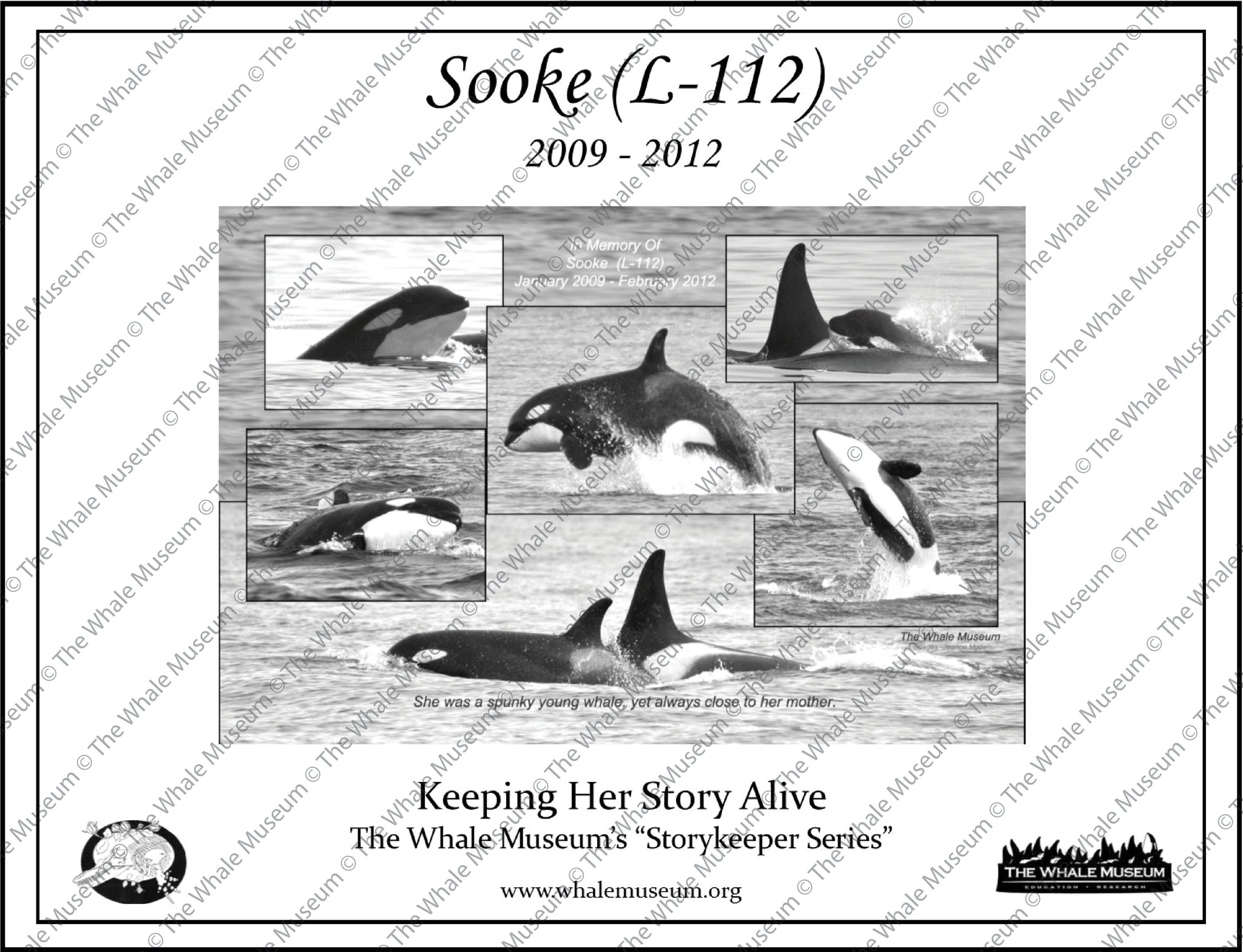 Alive just three years, Sooke (L-112) was well-known and loved because of her spunky personality. Her story is now told at The Whale Museum, where her skeleton and a model of her are displayed in remembrance.