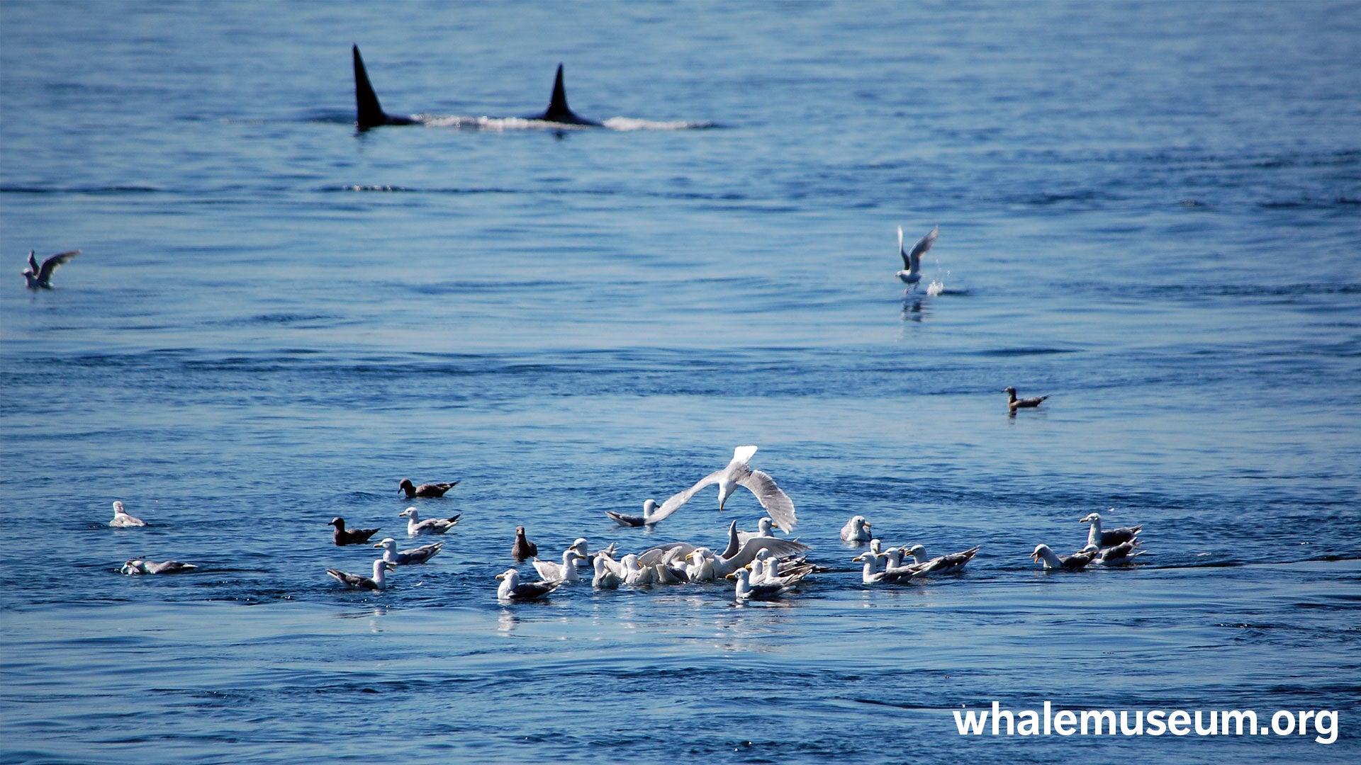 Photo of a bait ball with Orcas and Gulls that can be used as a virtual background for platforms like Zoom. Our gift to you when you make a $10 donation to support The Whale Museum.