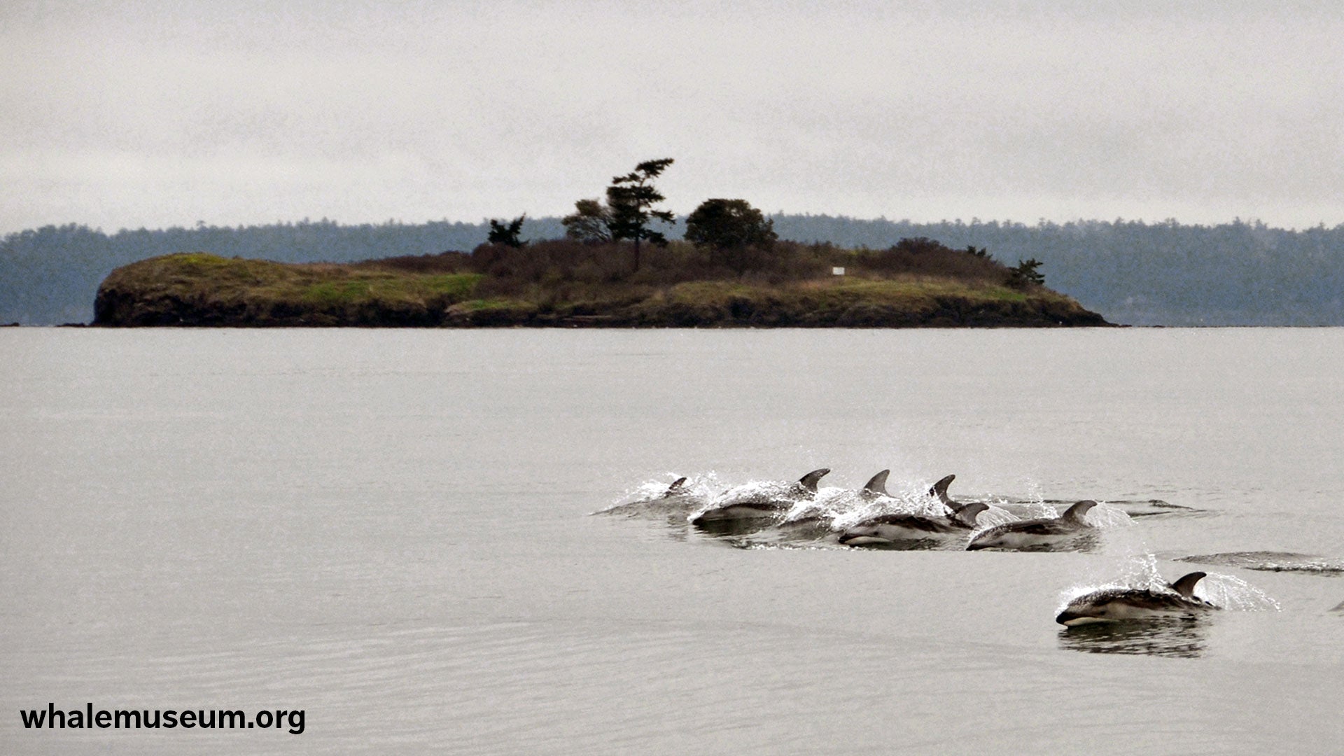 Photo of Pacific White-Sided Dolphins that can be used as a virtual background for platforms like Zoom. Our gift to you when you make a $10 donation to support The Whale Museum.