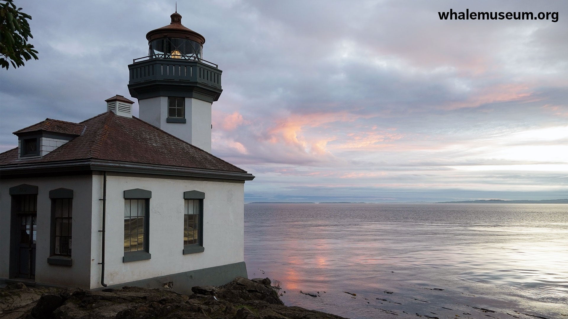 Photo of sunset behind the Lime Kiln Lighthouse that can be used as virtual background for platforms like Zoom. Our gift to you when you make a $10 donation to support The Whale Museum.