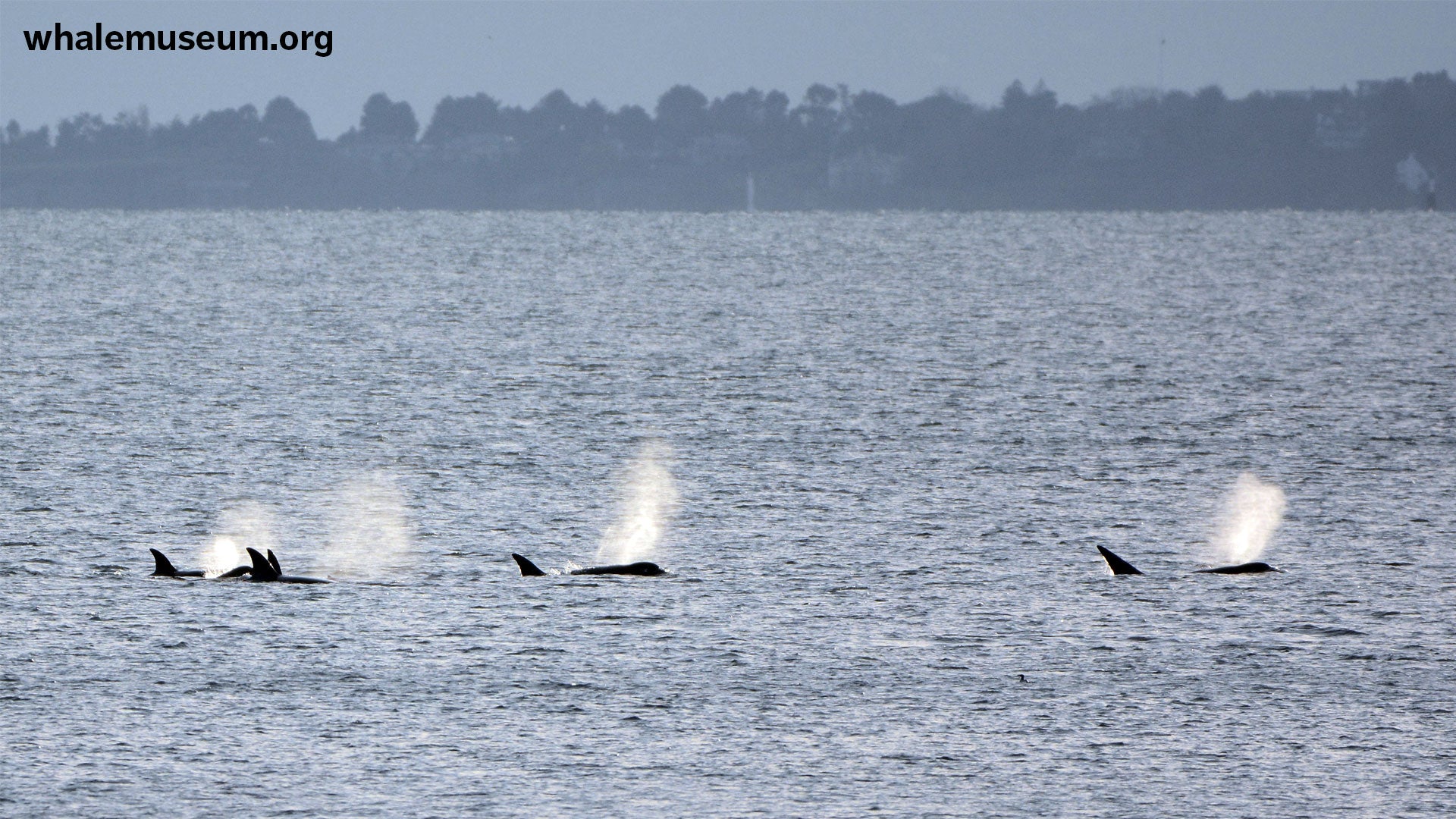 Photo of a group of Orcas traveling that can be used as a virtual background for platforms like Zoom. Our gift to you when you make a $10 donation to support The Whale Museum.