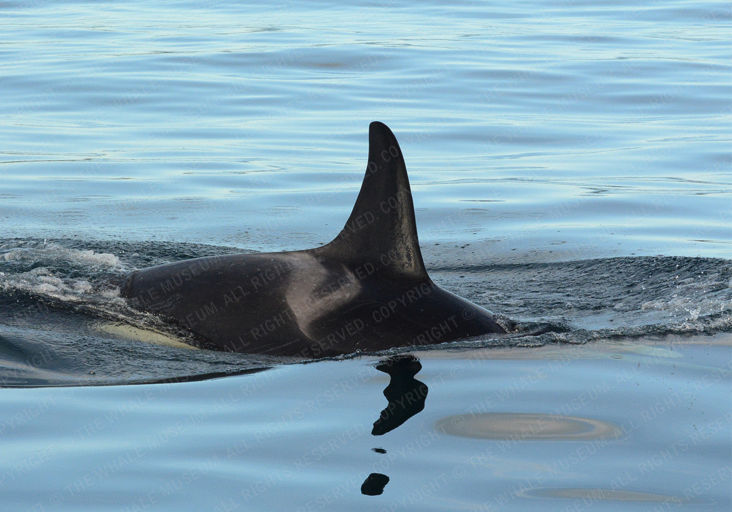 Echo is the fourth known calf of Slick (J-16). She is very active, often seen leaping above the surface. Echo is short for 'echolocation' which is what the whales use to navigate and forage.