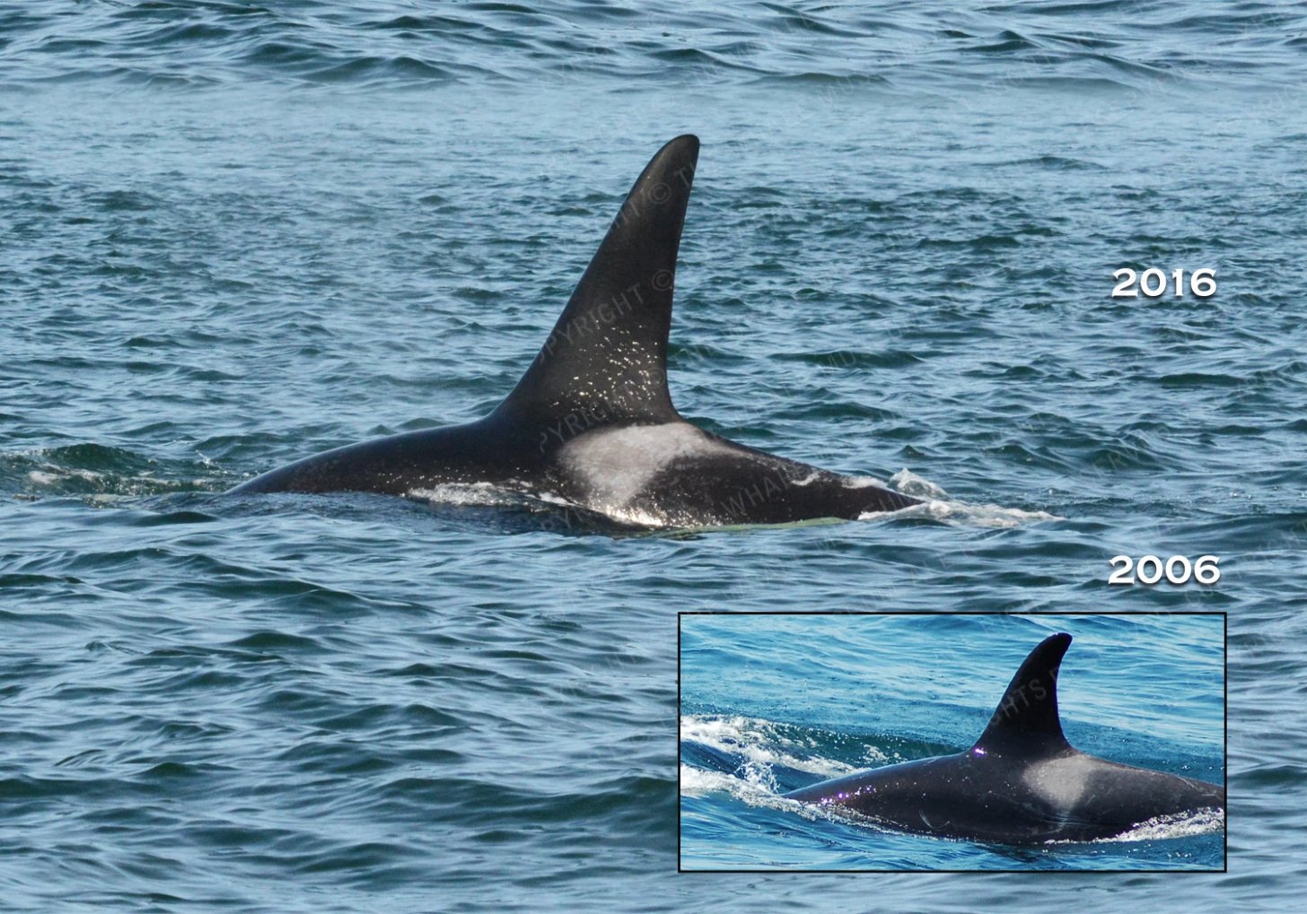 Tika’s name has Native American Chinook language origins meaning "swift." He is the first known offspring of Sekiu (K-22). His dorsal fin took on many shapes as it grew. He and his mother belong to the K12 family group.