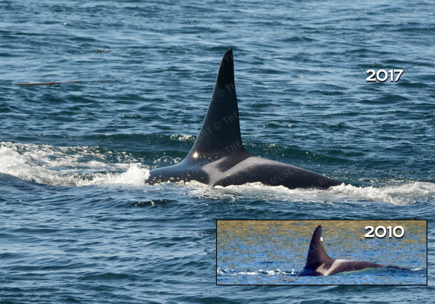 Fluke got his name because there was uncertainty as to who his mother was. After several encounters, researchers determined that Racer (L-72) is his mother. When he reached his teenage years his dorsal fin began sprouting.